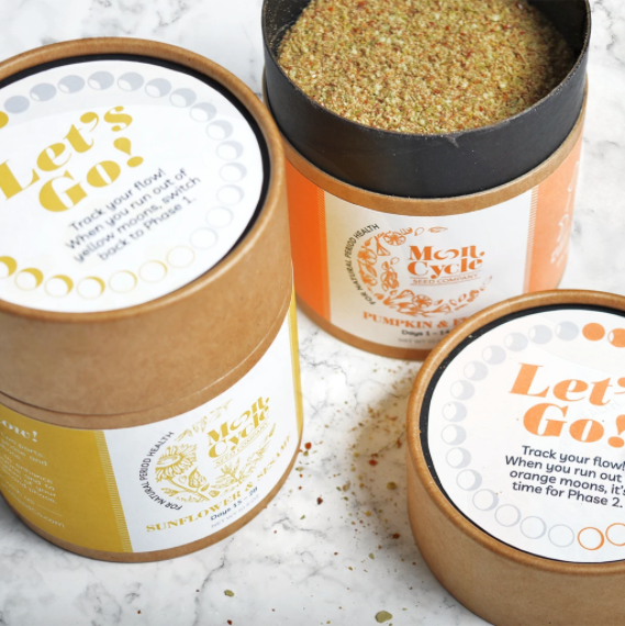 What to be mindful of when buying your seeds is that seeds need to be ground up really well in order to be digested. With the bigger seeds, pumpkin seeds and sunflower seeds, your teeth can do the work. But with sesame seeds and flaxseed, you need to have them ground. You can buy them freshly pre ground, refrigerate them and use them within a few weeks if you’d like. My current top pre ground blend is made by Moon Cycle Seed Co. They sell a blend for your first two phases and second two phases. It’s a fancy product that definitely makes things easier if you’re a busy gal.